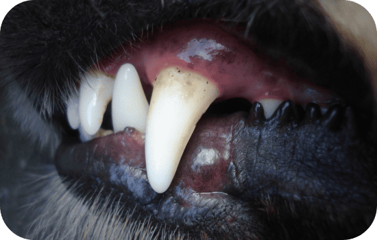 У собак кариозные поражения чаще развиваются на коронковой части зуба при длительном контакте с липкими углеводными остатками, при наличии выраженного налета и камня.